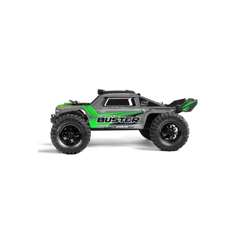 Le Pirate Buster est une voiture radiocommandée tout terrain à l'échelle 1/10 électrique 4x4 prêt à rouler. Son robuste châssis, son puissant moteur type 390, sa transmission entièrement sur roulements à billes avec deux différentiels à pignons et cardan central en acier traité, ses suspensions avec amortisseurs hydrauliques et ses pneus surdimensionnés lui permettent de se jouer à grande vitesse des pièges du terrain. Le récepteur radio et le variateur waterproof permettent au Pirate Riper de supporter les projections d’eau ou de neige*. La carrosserie en polycarbonate est peinte et décorée. Le pilotage est à la fois vif et précis grâce à un émetteur type volant/gâchette ergonomique 2,4 GHz. Séduisant, rapide, robuste, bien protégé et super équipé, le Pirate Riper est le modèle idéal pour aborder l’univers passionnant de la voiture radiocommandée !