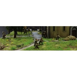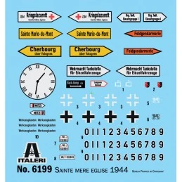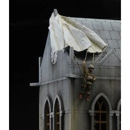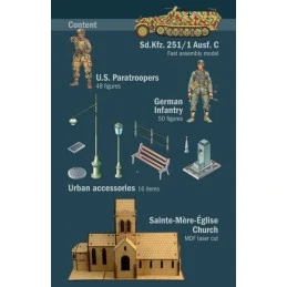 Ce coffret permet de réaliser un diorama représentatif des combats de Sainte-Mère-Eglise. Il comprend une reproduction de l’église en bois découpé laser, des accessoires urbains, des parachutistes américains, des fantassins allemands et un semi-chenillé allemand Sd.KfZ.251 Ausf.C.